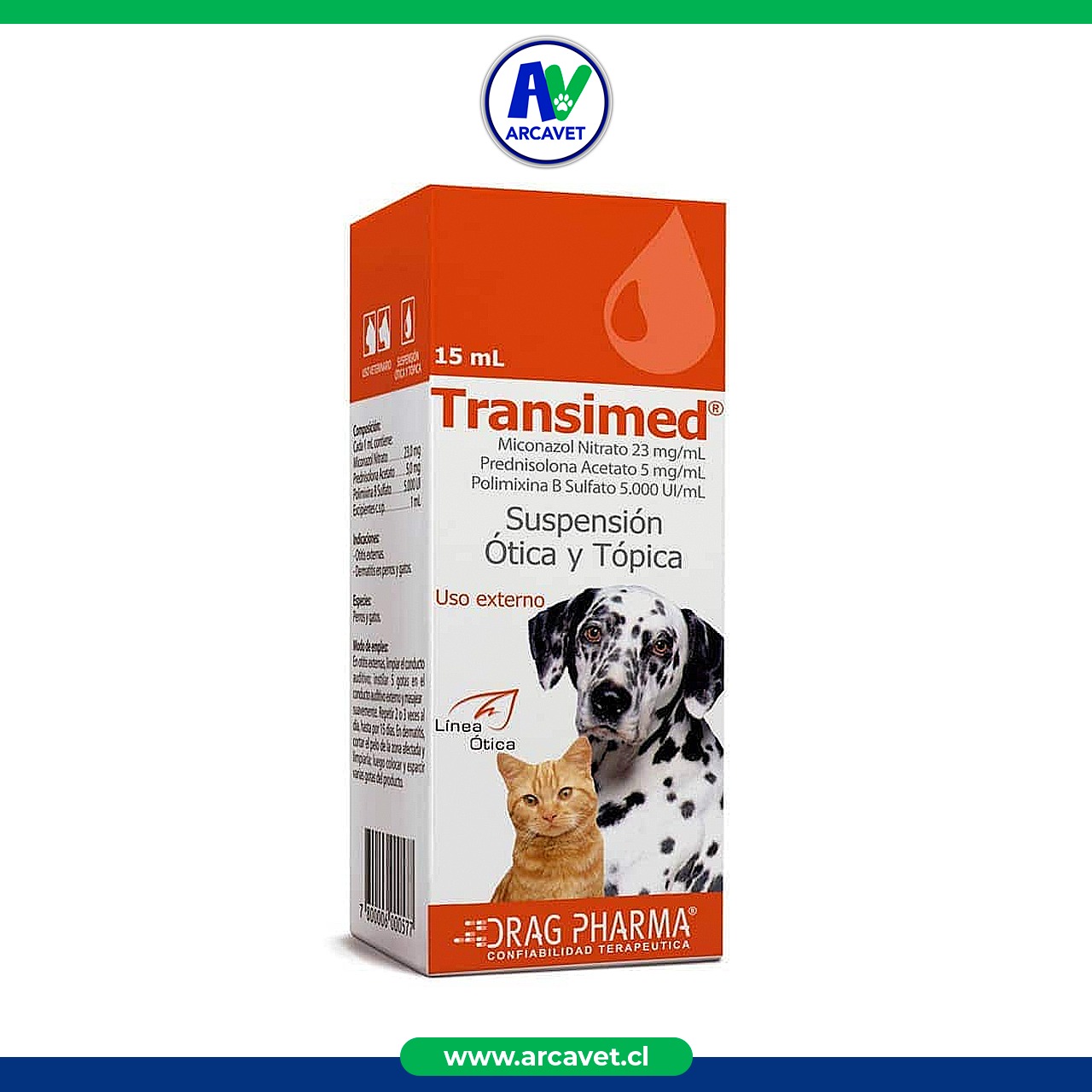 Transimed se indica en el tratamiento de otitis externas y dermatitis causadas por hongos, levaduras y bacterias Gram (-)